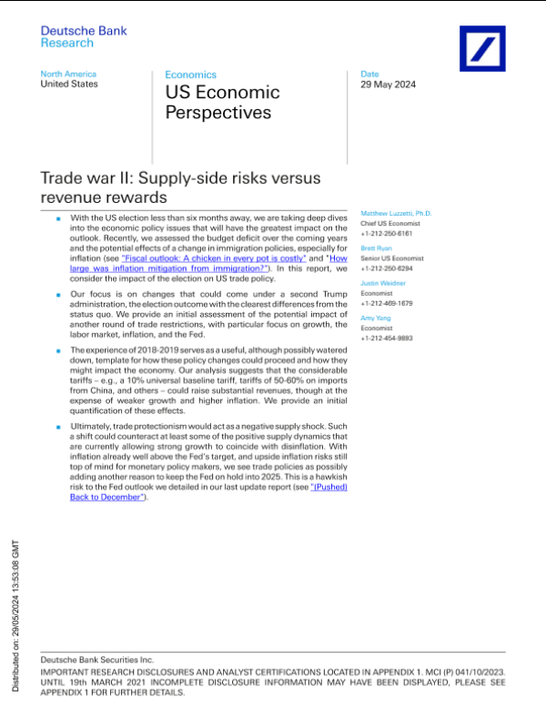 【Deutsche Bank Research】【20240529】US Economic Perspectives Trade war II Supply-side risks versus revenue rewards-18页