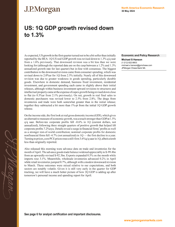 【J.P. Morgan】【20240530】1Q US GDP growth revised down to 1.3%-9页