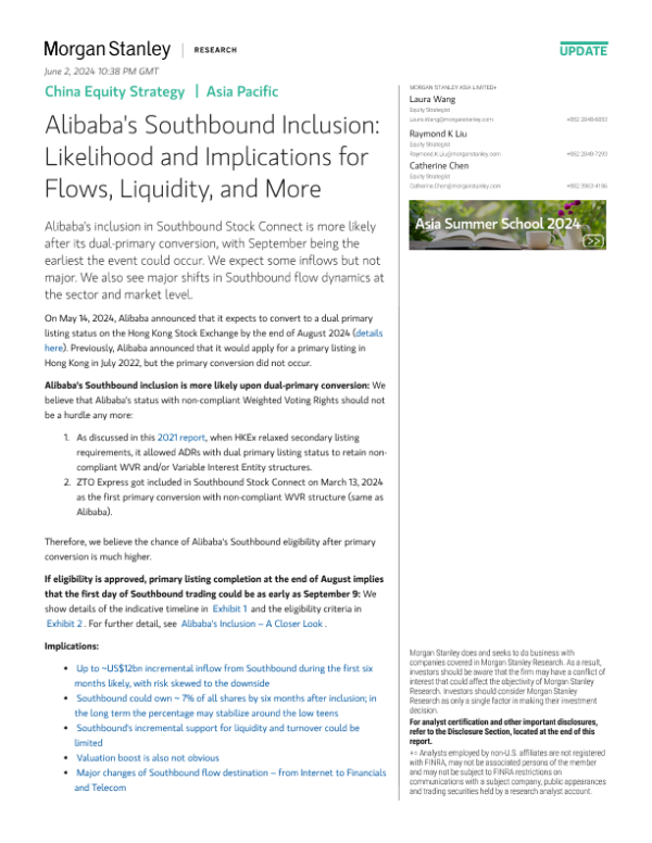 【Morgan Stanley】【20240514】Alibaba's Southbound Inclusion Likelihood and Implications for Flows, Liquidity, and More-17页