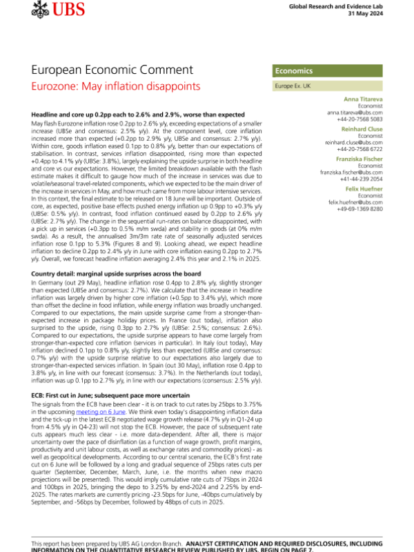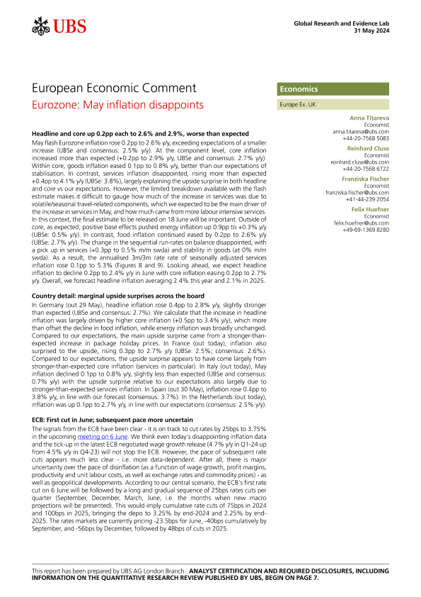 【UBS AG London Branch】【20240531】Eurozone May inflation disappoints-10页
