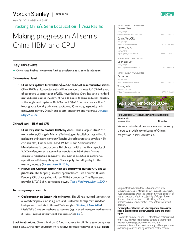 【Morgan Stanley】【20240527】追踪中国半导体本地化进程:在AI芯片领域取得进展——中国HBM和CPU-20页