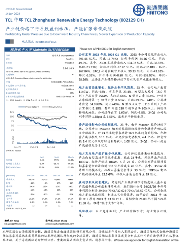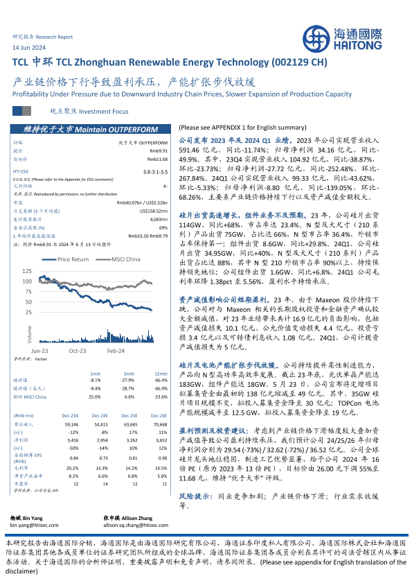 【海通国际】【20240614】TCL中环(002129)产业链价格下行导致盈利承压,产能扩张步伐放缓-13页