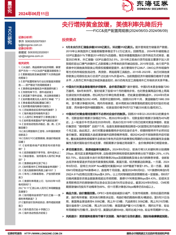 【东海证券】【20240611】FICC&资产配置周观察:央行增持黄金放缓,美债利率先降后升-15页