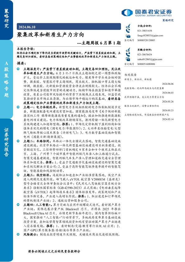 【国泰君安证券】【20240610】主题周报6月第1期:聚集改革和新质生产力方向-22页