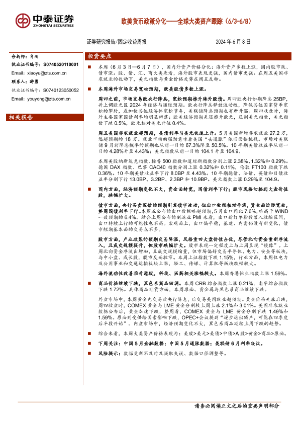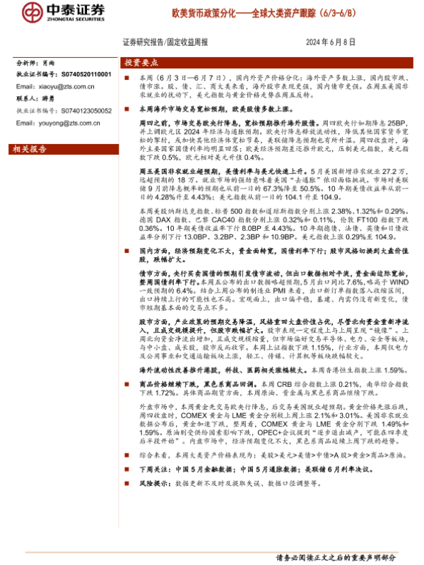 【中泰证券】【20240608】全球大类资产跟踪:欧美货币政策分化-15页