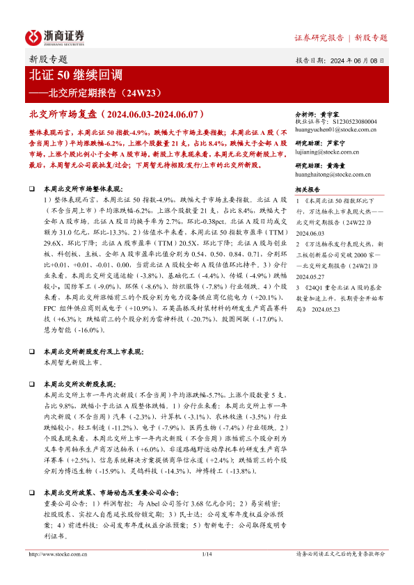 【浙商证券】【20240608】北交所定期报告(24W23):北证50继续回调-14页