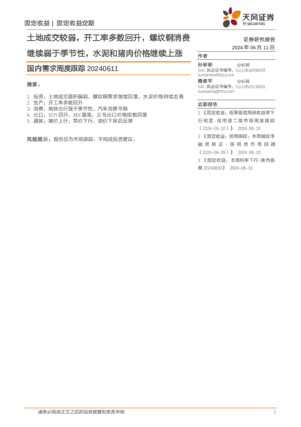 土地成交 开工率 水泥价格 猪肉价格 螺纹钢消费