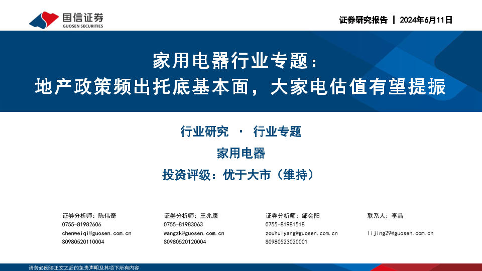 【国信证券】【20240611】家用电器行业专题:地产政策频出托底基本面,大家电估值有望提振-20页