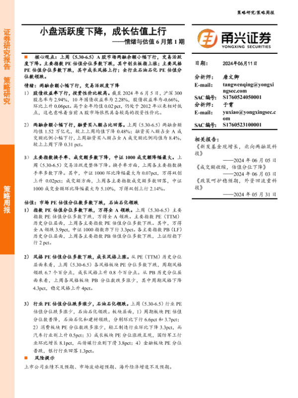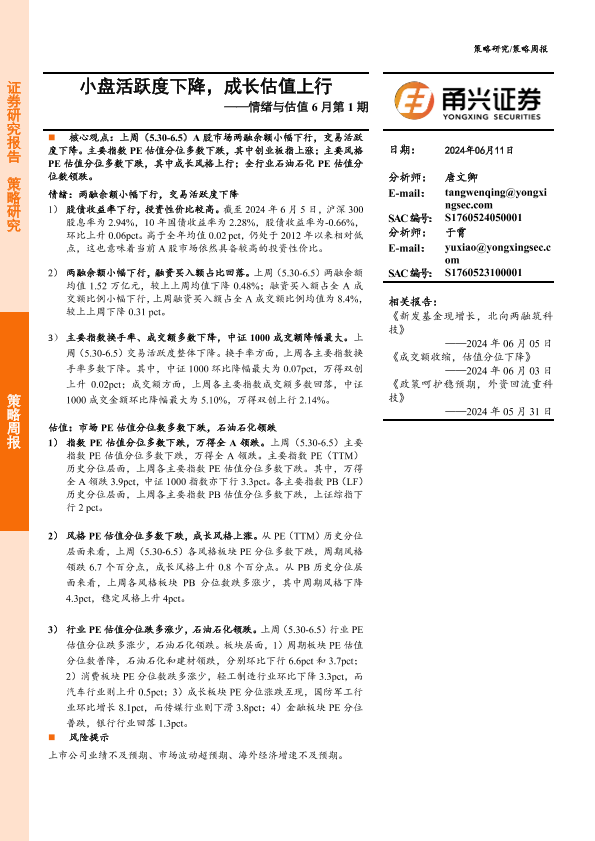 【甬兴证券】【20240611】情绪与估值6月第1期:小盘活跃度下降,成长估值上行-10页