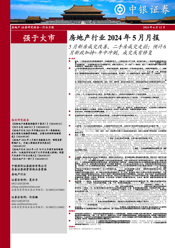 【中银证券】【20240612】房地产行业2024年5月月报:5月新房成交改善,二手房成交走弱;预计6月新政加持+年中冲刺,成交或有修复-29页