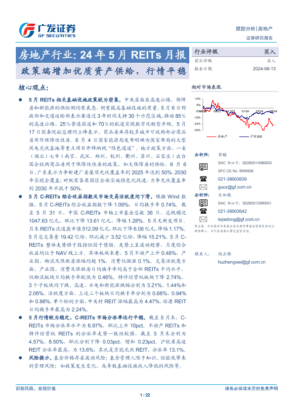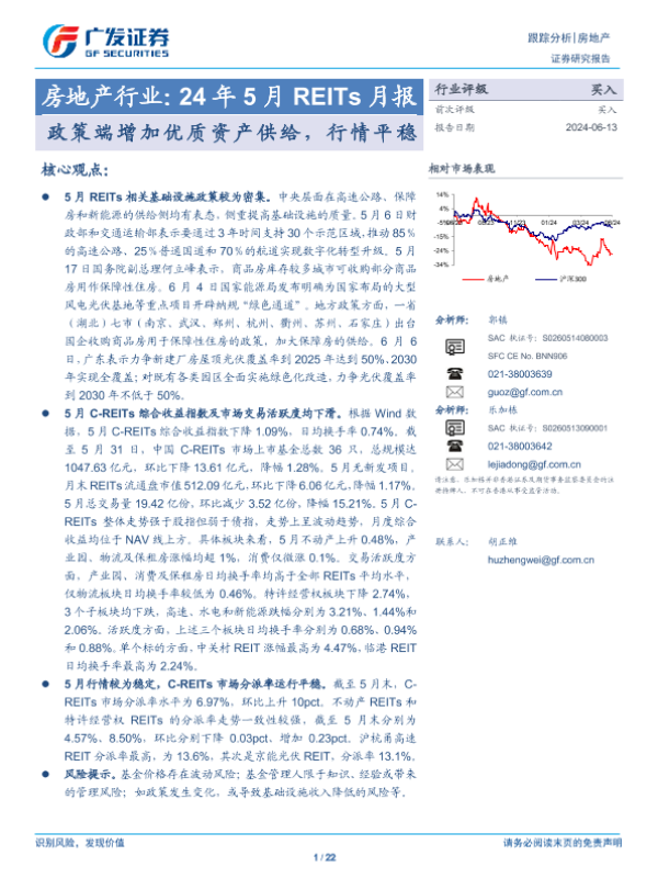 【广发证券】【20240613】房地产行业24年5月REITs月报:政策端增加优质资产供给,行情平稳-22页