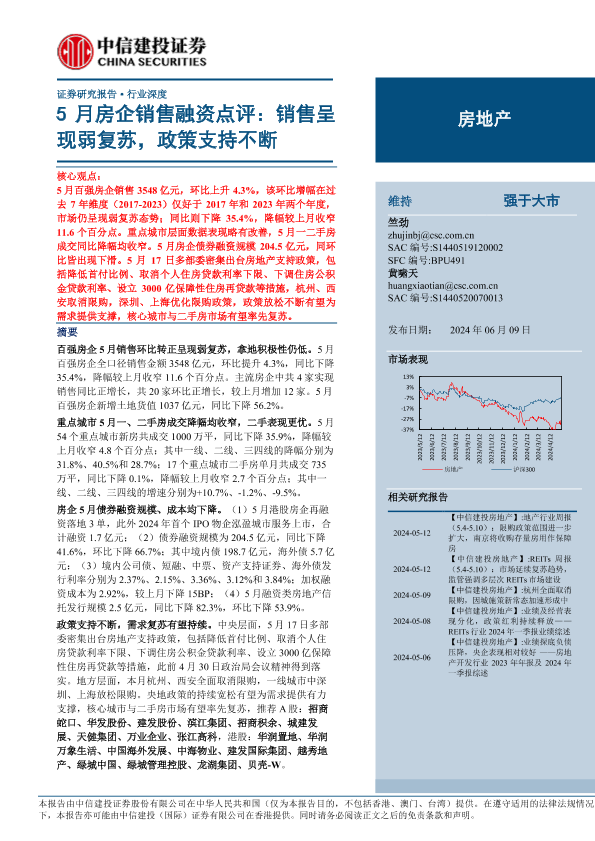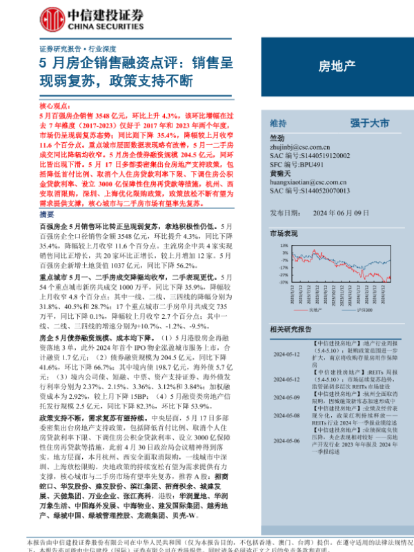 【中信建投证券】【20240609】房地产行业5月房企销售融资点评:销售呈现弱复苏,政策支持不断-24页