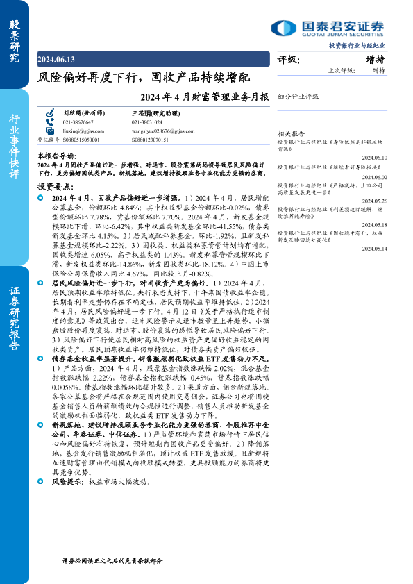 【国泰君安证券】【20240613】投资银行业与经纪业行业2024年4月财富管理业务月报:风险偏好再度下行,固收产品持续增配-12页