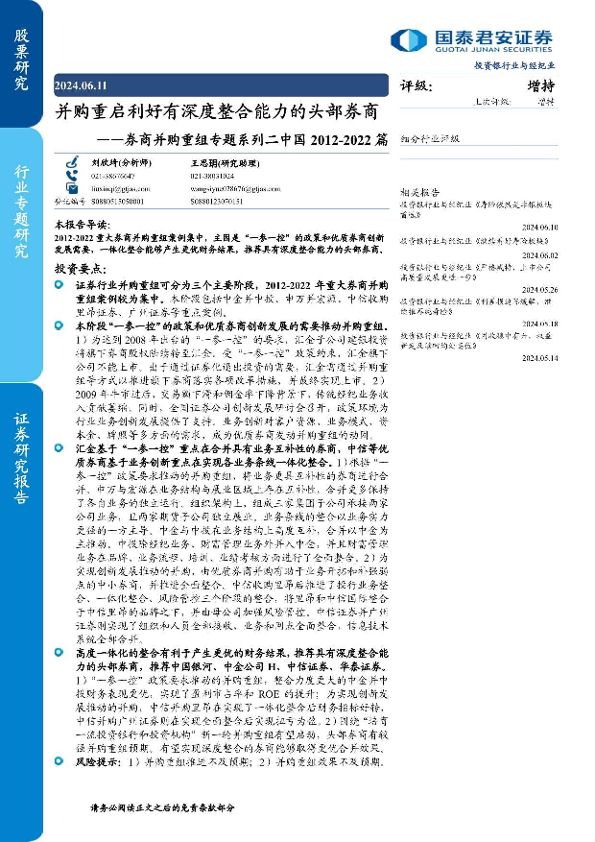 【国泰君安证券】【20240611】投资银行业与经纪业行业券商并购重组专题系列二中国2012-2022篇:并购重启利好有深度整合能力的头部券商-22页