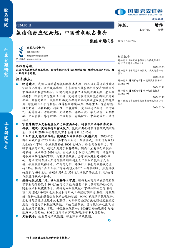 【国泰君安证券】【20240611】新兴能源行业氢能专题报告:氢洁能源应运而起,中国需求独占鳌头-29页