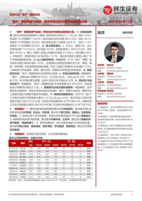 【民生证券】【20240611】旅游行业“端午”数据总结:“端午”假期高景气延续,旅游年轻化和本地周边游趋势凸显-12页