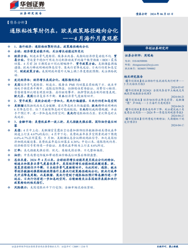 【华创证券】【20240603】4月海外月度观察:通胀粘性掣肘仍在,欧美政策路径趋向分化-20页