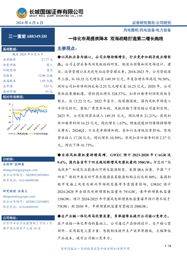 【长城国瑞证券】【20240606】三一重能(688349)一体化布局提质降本,双海战略打造第二增长曲线-34页