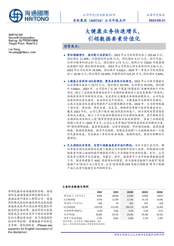 【海通国际】【20240531】东软集团-600718.SH-公司年报点评:大健康业务快速增长,引领数据要素价值化-12页
