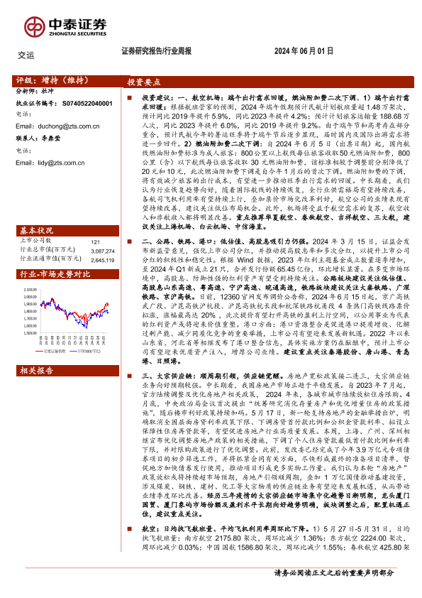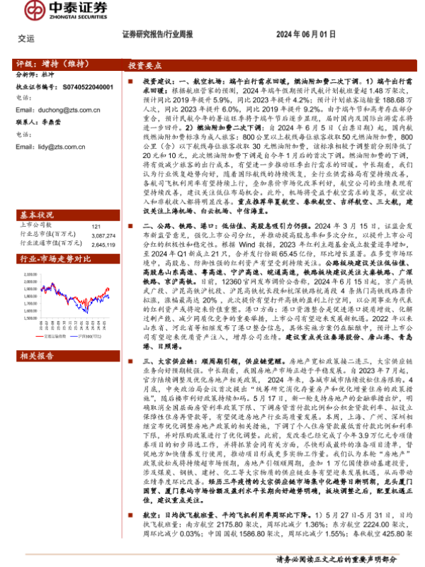 【中泰证券】【20240601】交通运输行业:端午出行需求回暖,燃油附加费二次下调-39页