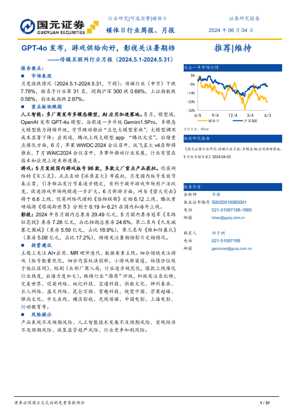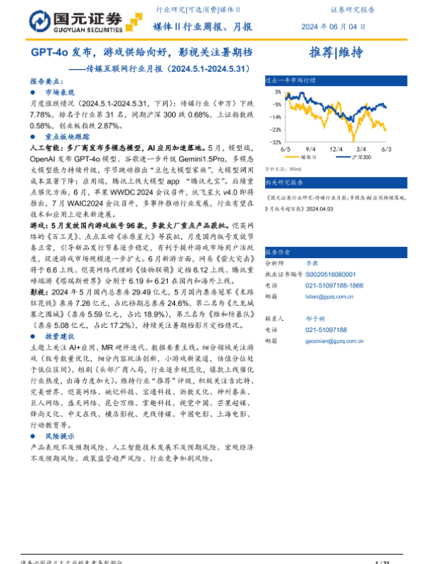 【国元证券】【20240604】传媒互联网行业月报:GPT-4o发布,游戏供给向好,影视关注暑期档-31页