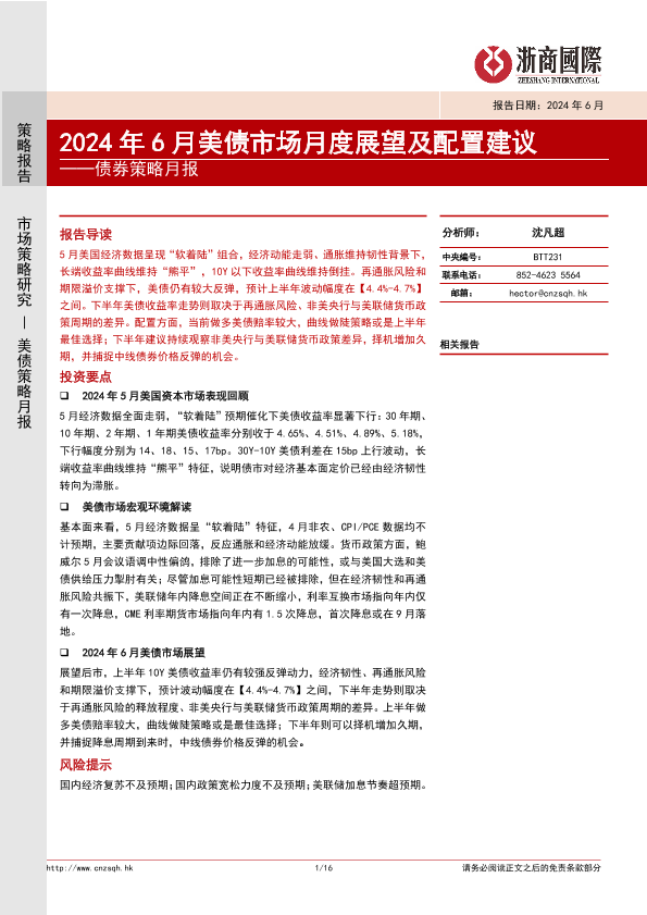 【浙商国际】【20240604】2024年6月美债市场月度展望及配置建议-16页