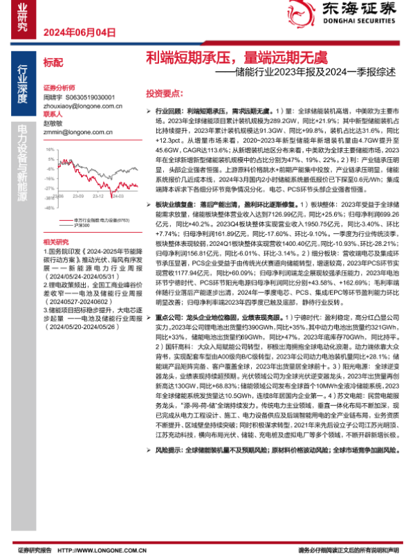 【东海证券】【20240604】储能行业2023年报及2024一季报综述:利端短期承压,量端远期无虞-19页