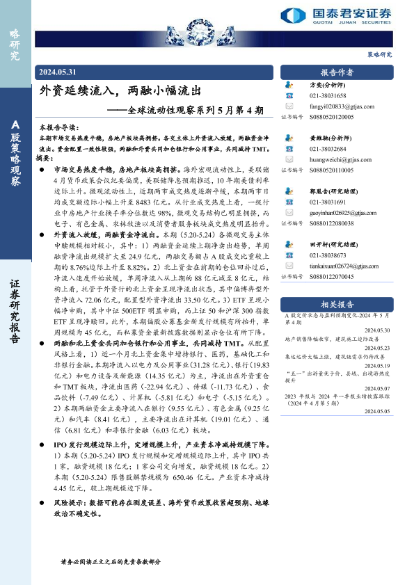 【国泰君安证券】【20240531】全球流动性观察系列5月第4期:外资延续流入,两融小幅流出-22页