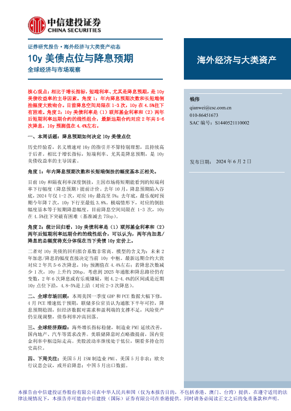 【中信建投证券】【20240602】全球经济与市场观察:10y美债点位与降息预期-12页