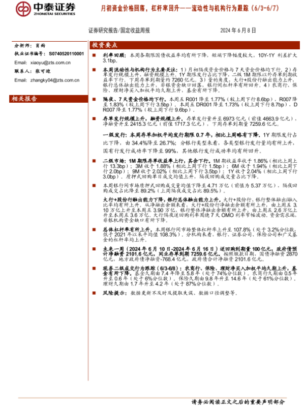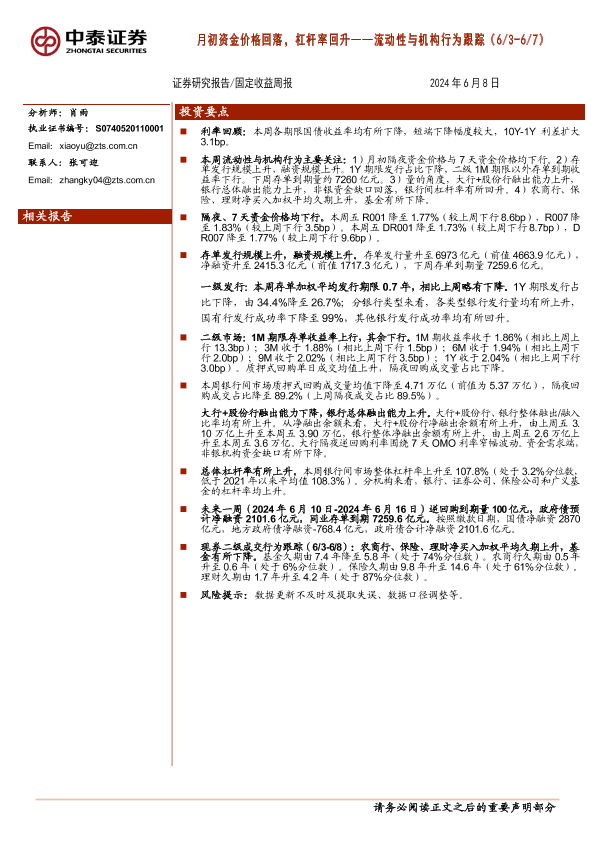 【中泰证券】【20240608】流动性与机构行为跟踪:月初资金价格回落,杠杆率回升-13页