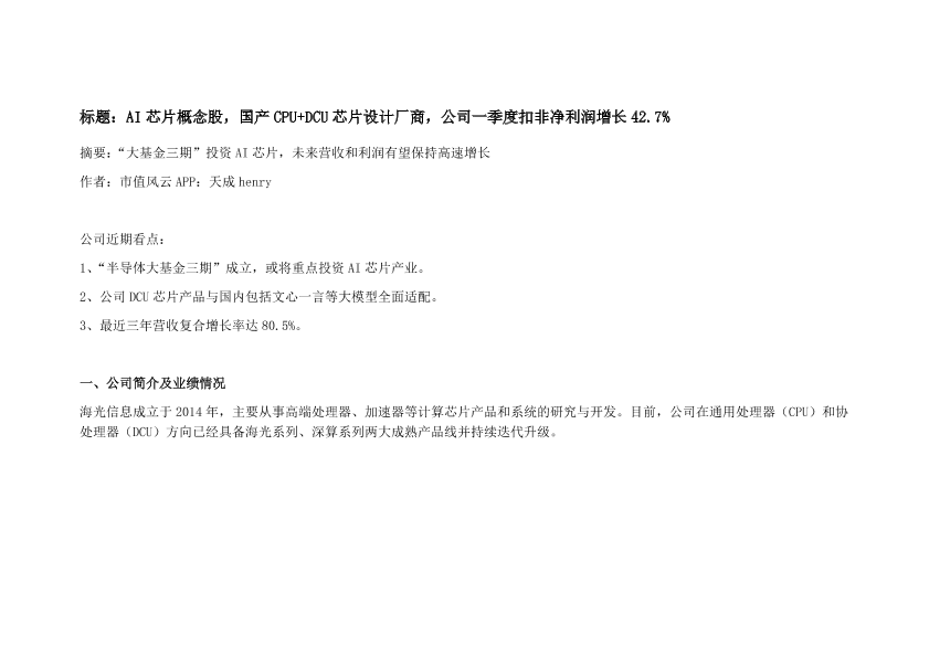 【市值风云】【20240605】AI芯片概念股,国产 CPU+DCU芯片设计厂商,公司一季度扣非净利润增长 42.7%-10页