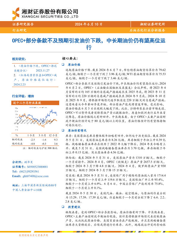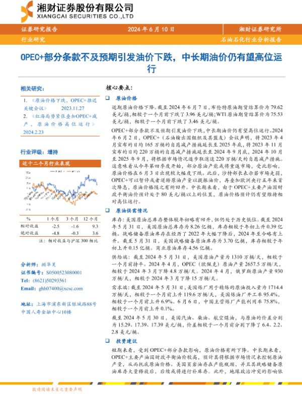 【湘财证券】【20240610】石油石化行业:OPEC+部分条款不及预期引发油价下跌,中长期油价仍有望高位运行-11页
