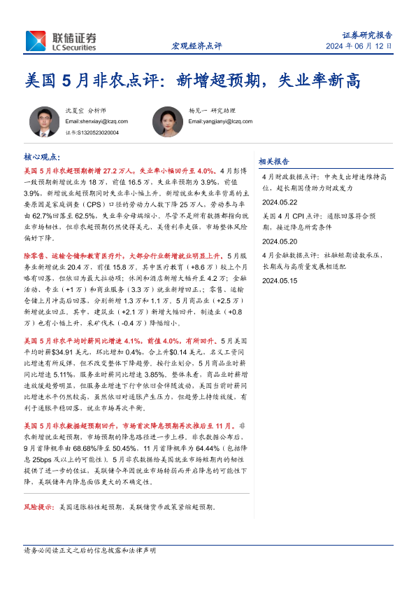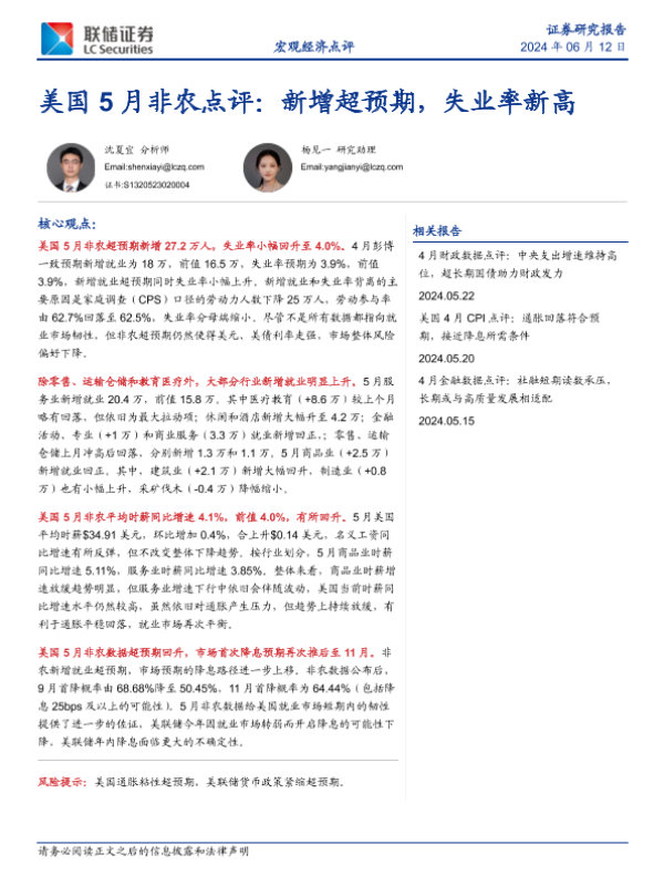 【联储证券】【20240612】美国5月非农点评:新增超预期,失业率新高-10页