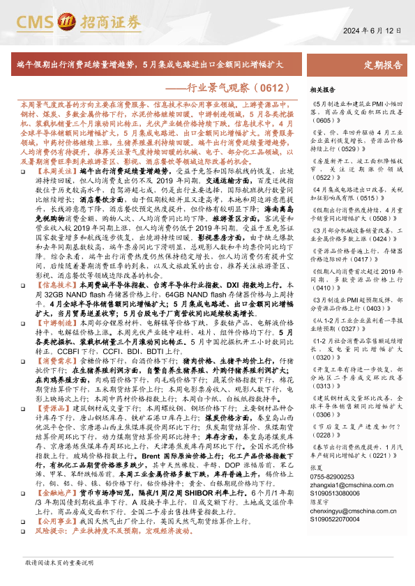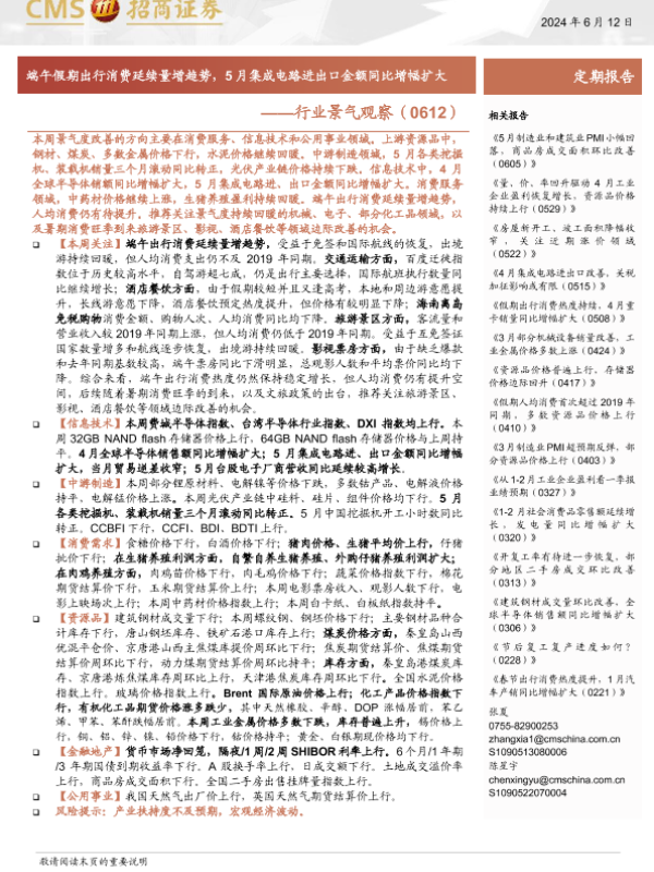 【海通证券】【20240612】行业景气观察:端午假期出行消费延续量增趋势,5月集成电路进出口金额同比增幅扩大-33页