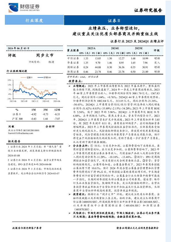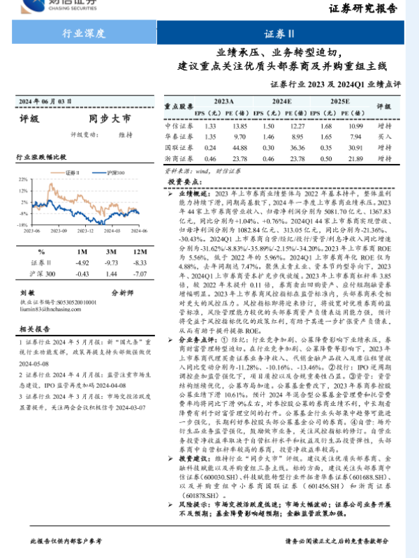 【财信证券】【20240603】证券行业2023及2024Q1业绩点评:业绩承压、业务转型迫切,建议重点关注优质头部券商及并购重组主线-21页