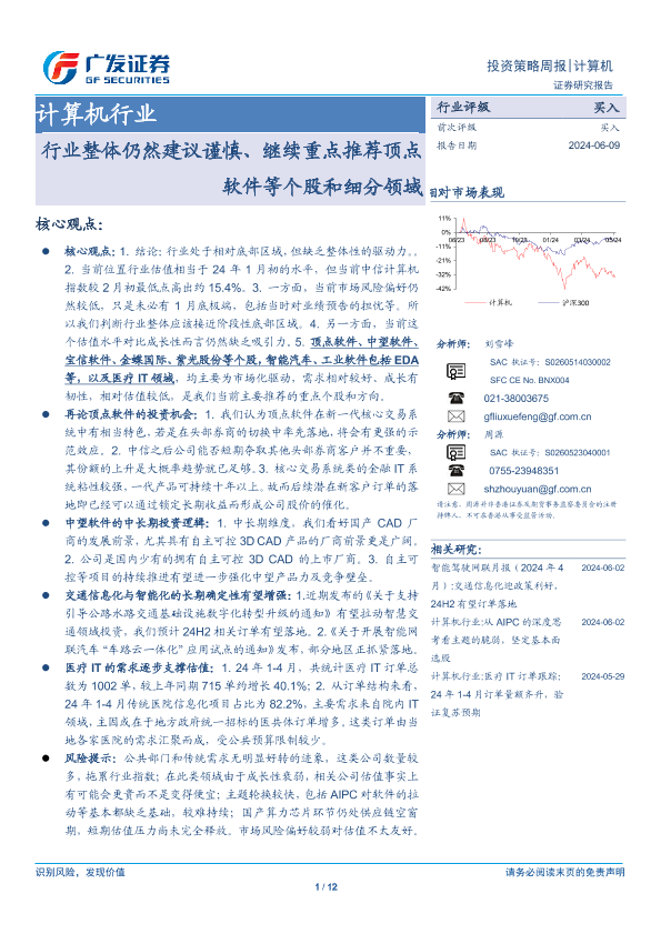 【广发证券】【20240609】计算机行业:行业整体仍然建议谨慎、继续重点推荐顶点软件等个股和细分领域-12页