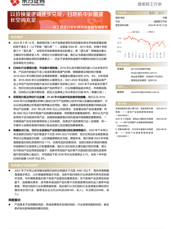 【东方证券】【20240612】轻工制造行业长期投资逻辑专题研究:以价换量逻辑逐步兑现,扫地机中长期成长空间充足-23页