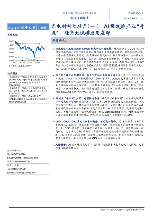 【海通证券】【20240611】通信设备行业光电材料之硅光(一):AI爆发迎产业“奇点”,硅光大规模应用在即-24页