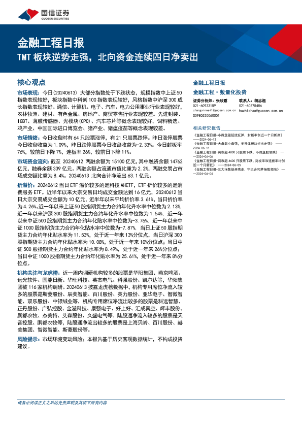 【国信证券】【20240613】金融工程:TMT板块逆势走强,北向资金连续四日净卖出-15页