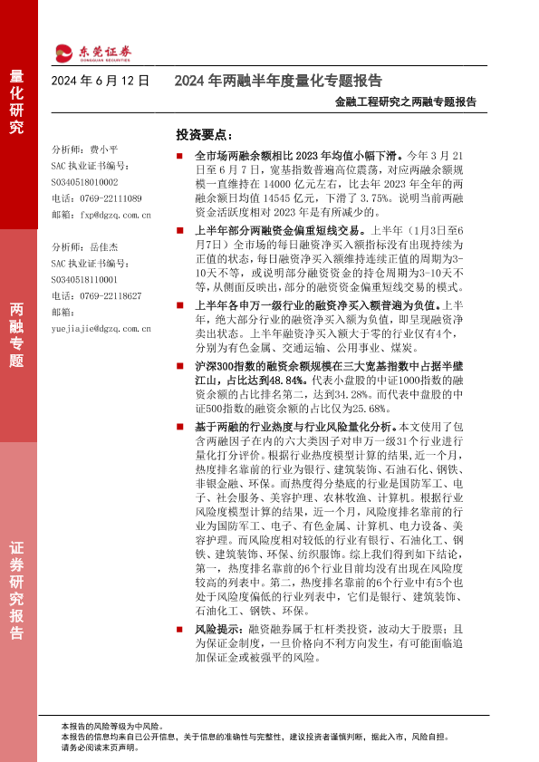 【东莞证券】【20240612】金融工程研究之两融专题报告:2024年两融半年度量化专题报告-14页