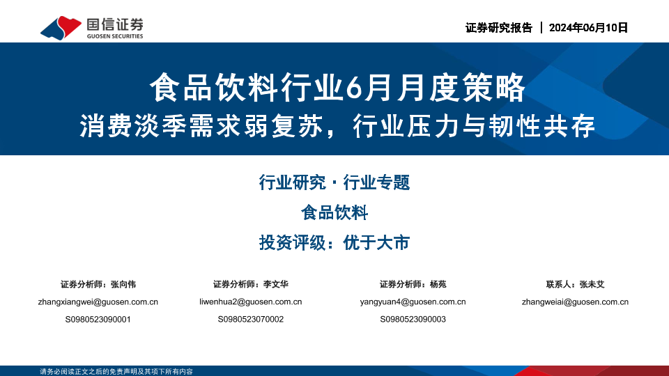 【国信证券】【20240610】食品饮料行业6月月度策略:消费淡季需求弱复苏,行业压力与韧性共存-24页
