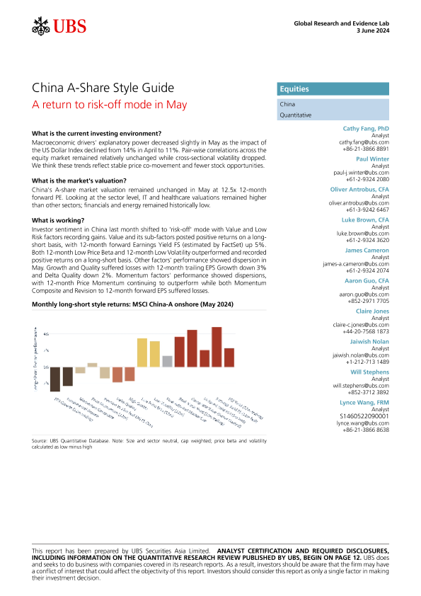 【UBS Securities Asia Limited】【20240603】UBS Equities-China A-Share Style Guide A return to risk-off mode in May-16页