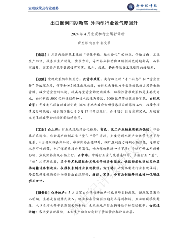 【研发部何金中郭文硕】【202404】出口额创同期新高 外向型行业景气度回升——2024年4月宏观和行业运行简析-14页