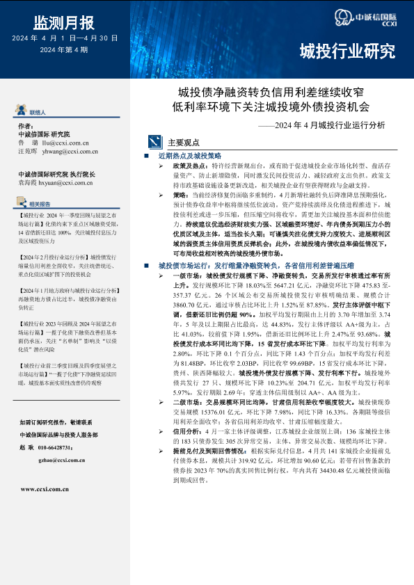 【中诚信国际】【20240401】城投债净融资转负信用利差继续收窄,低利率环境下关注城投境外债投资机会-17页