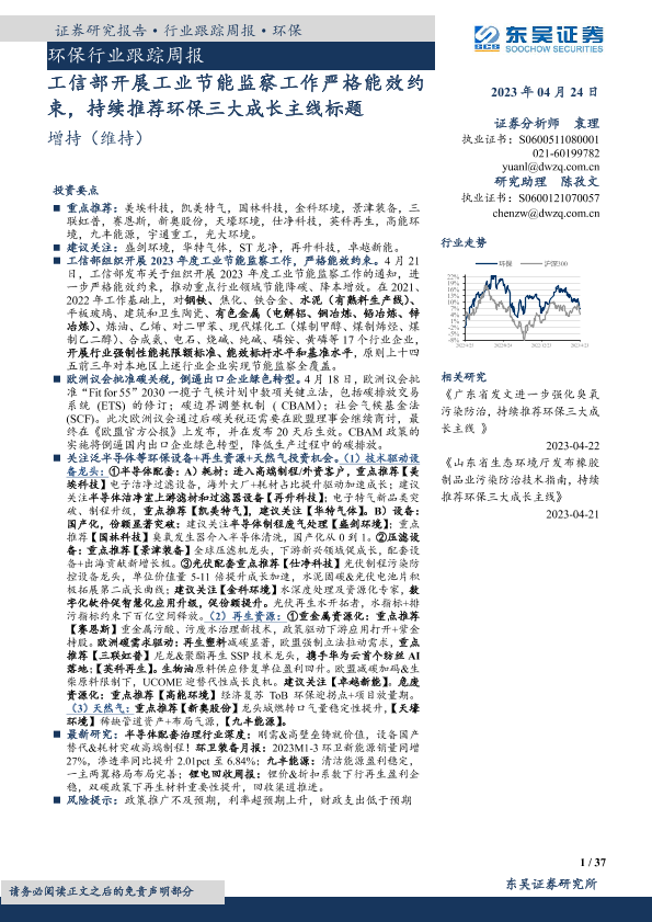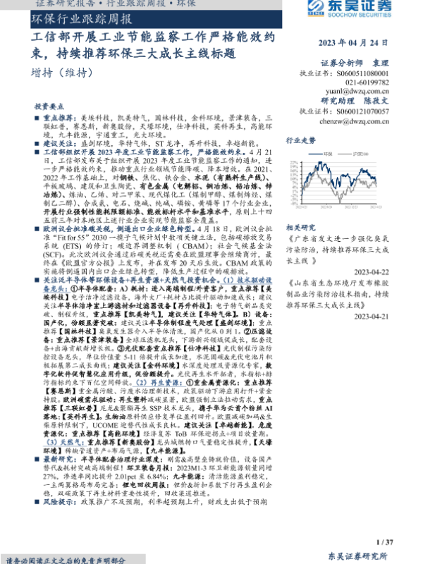 【东吴证券】【20230424】环保行业跟踪周报:工信部开展工业节能监察工作严格能效约束,持续推荐环保三大成长主线-37页