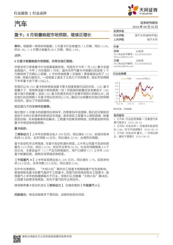 【天风证券】【20190903】汽车行业点评:重卡:8月销量略超市场预期,继续正增长-9页