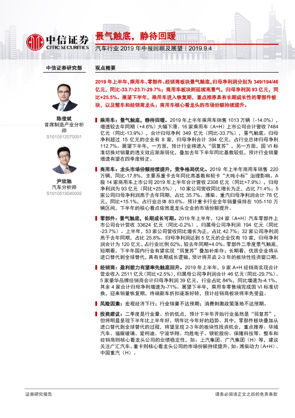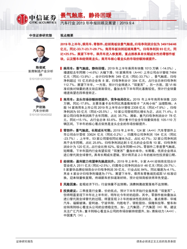 【中信证券】【20190904】汽车行业2019年中报回顾及展望:景气触底,静待回暖-17页