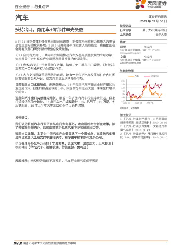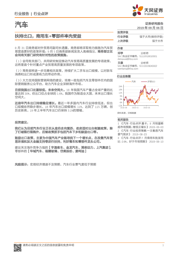【天风证券】【20190906】汽车行业点评:扶持出口,商用车+零部件率先受益-5页