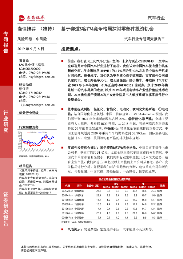 【东莞证券】【20190906】20190906-东莞证券-汽车行业专题报告:基于赛道&客户&竞争格局探讨零部件投资机会-9页