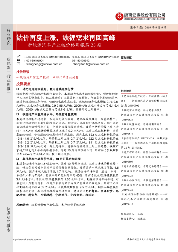 【浙商证券】【20190909】新能源汽车产业链价格周报第26期:钴价再度上涨,铁锂需求再回高峰-7页